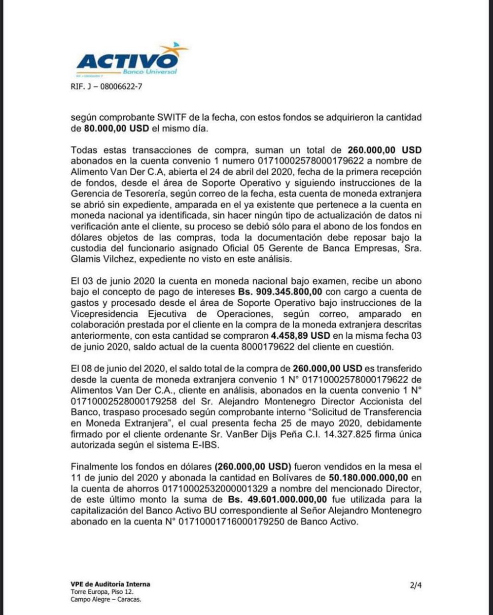 Finalmente los fondos en dólares (260.000,00 USD) fueron vendidos en la mesa el 11 de junio del 2020 y abonada la cantidad en Bolívares de 50.180.000.000,00 en la cuenta de ahorros 01710002532000001329 a nombre del mencionado Director, de este último monto la suma de Bs. 49.601.000.000,00 fue utilizada para la capitalización del Banco Activo BU correspondiente al Señor Alejandro Montenegro Diaz abonado en la cuenta N° 01710001716000179250 de Banco Activo.