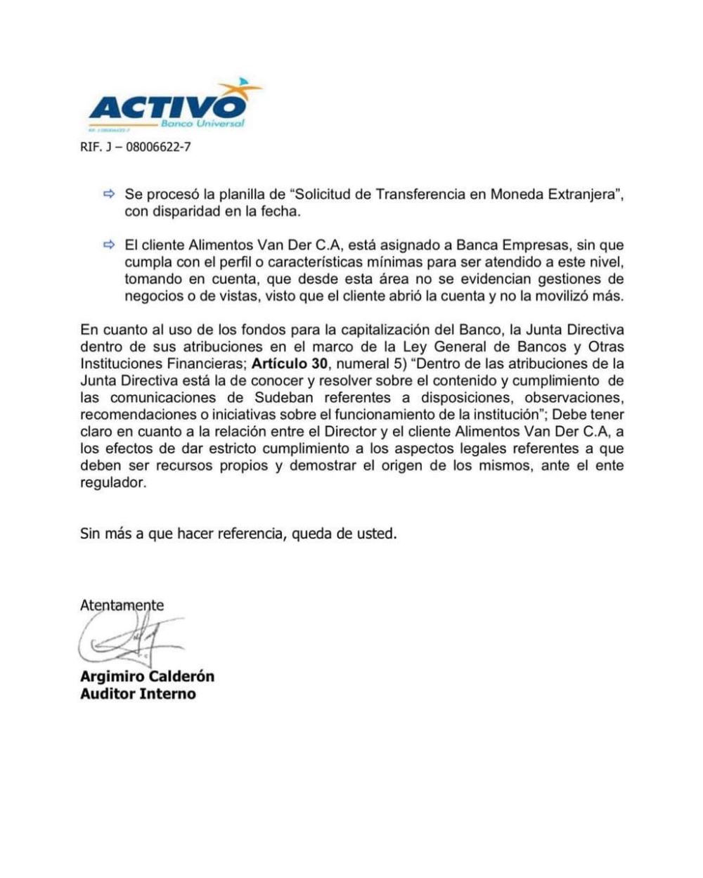 Siguiendo instrucciones de la Vicepresidencia Ejecutiva de la Junta Directiva y Vicepresidencia Ejecutiva Corporativa, se efectuó análisis de la cuentas en moneda nacional y extranjera, a nombre del cliente persona jurídica identificada con el RIF J-41281643–8 de Alimentos Van Der C.A.