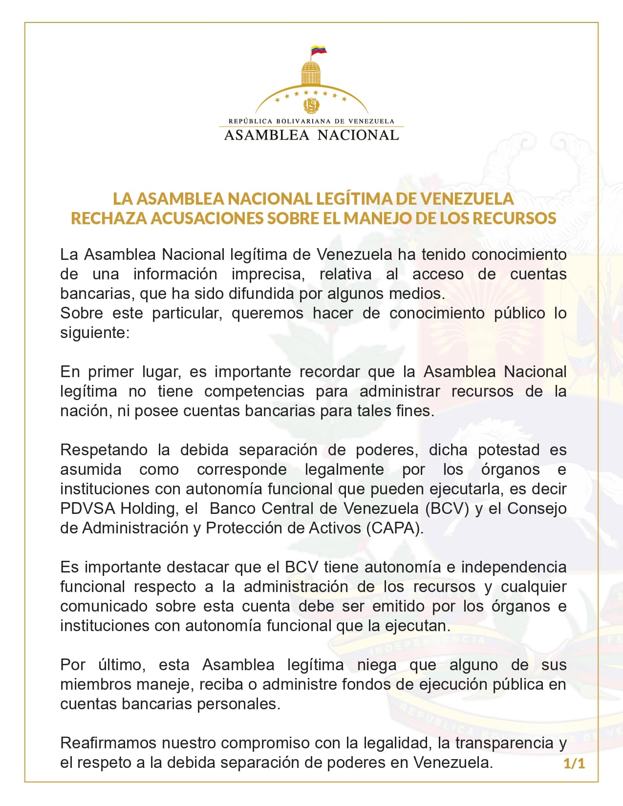 Por último, esta Asamblea legítima niega que alguno de sus miembros maneje, reciba o administre fondos de ejecución pública en cuentas bancarias personales.