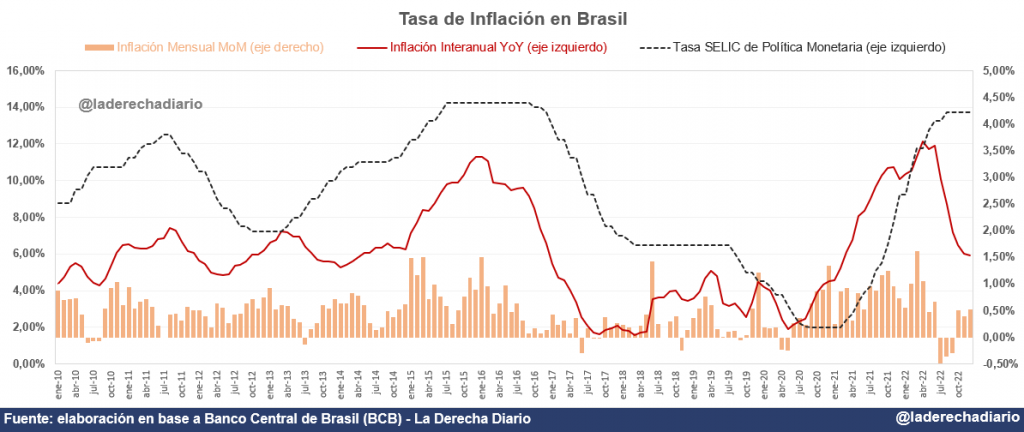 La medición de la expansión de precios acumulada en los últimos 12 meses también es evidencia del proceso desinflacionario. La inflación interanual retrocedió al 5,9% en el mes de diciembre, después de haber alcanzado un máximo de hasta el 12,13% en abril. Brasil registra la tasa de inflación acumulada de 12 meses más baja desde febrero de 2021. El resultado efectivamente observado fue muy similar a la proyección de 5,7% realizada por la autoridad monetaria del país.