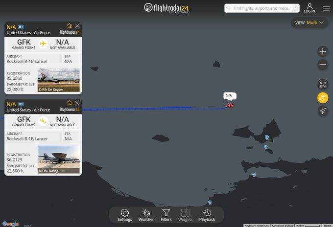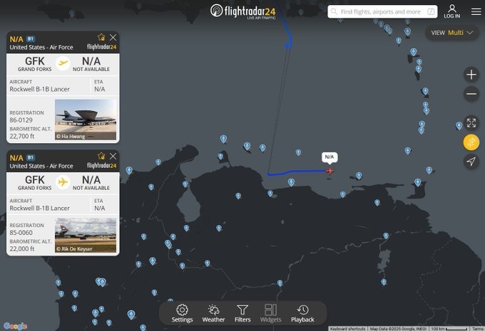 Monitores de tráfico aéreo reportaron este lunes 27 de octubre la presencia de bombarderos B-1B de la Fuerza Aérea de Estados Unidos sobrevolando el mar Caribe, específicamente en la zona entre la isla La Blanquilla y la isla de Margarita, en Venezuela. Según imágenes y datos de vuelo, estas aeronaves militares aparecieron a menos de 70 millas (112 kilómetros) del territorio continental venezolano, con uno de los vuelos a una distancia aproximada de 20 millas (33 kilómetros) de la isla de Margarita. Este avistamiento se produce en un contexto de incremento de la presencia militar estadounidense en la región, como parte de la operación antinarcóticos declarada por Donald Trump, que intensifica la presión sobre el régimen de Nicolás Maduro.