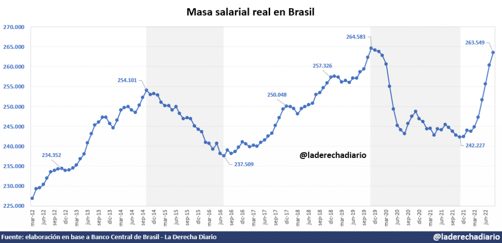 Las estadísticas del Banco Central de Brasil confirmaron que la masa salarial real del total de los puestos de trabajo (públicos y privados) tuvo un crecimiento de hasta 8,7% entre diciembre de 2021 y agosto de 2022. De esta manera, se recuperó prácticamente todo el terreno perdido por la pandemia desde marzo de 2020.
