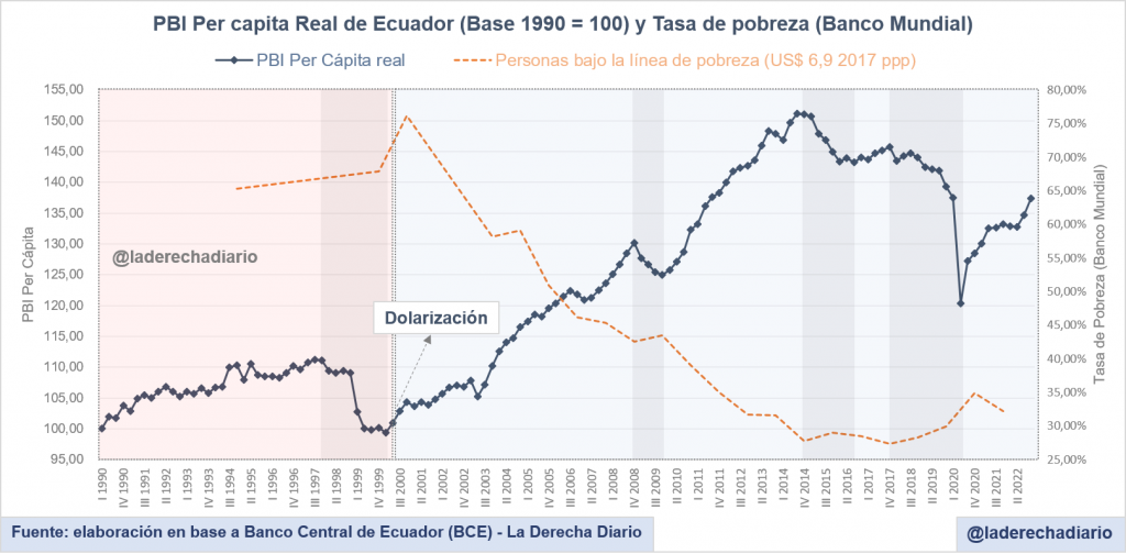 El ingreso real por habitante acumuló una caída del 1% entre el primer trimestre de 1990 y el mismo trimestre del año 2000, la mayor parte concentrada en la brutal crisis financiera del año 1999. Esto cambió radicalmente con el proceso de dolarización, ya que el PBI per cápita a precios constantes se expandió un 36% hasta el cuarto trimestre de 2022, y hasta un 49,6% si se compara contra el cuarto trimestre de 2014 (el máximo nivel alcanzado en la historia ecuatoriana).