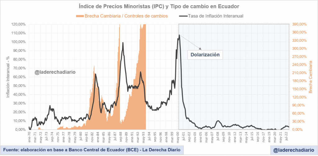 Al igual que Argentina, la economía de Ecuador se caracterizaba por su elevada inestabilidad de precios y los múltiples controles cambiarios que aplicados por diversos Gobiernos a fin de reprimir la demanda de divisas como una suerte de refugio a la inflación. La inflación minorista promedió el 29% entre 1970 y 2000, y un aumento promedio mensual del 2,14%.