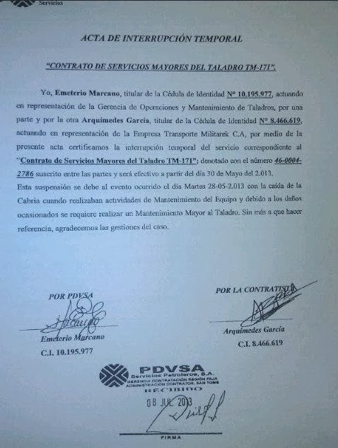 Documento donde constata de que Gerente distrito PDVSA San Tome estan al tanto irregularidad grave corrupcion en MILITAREK.