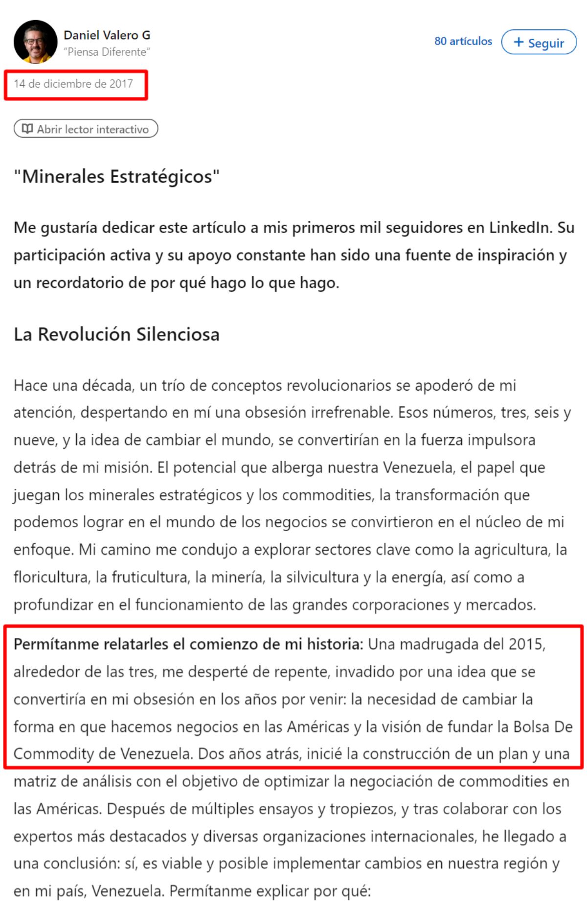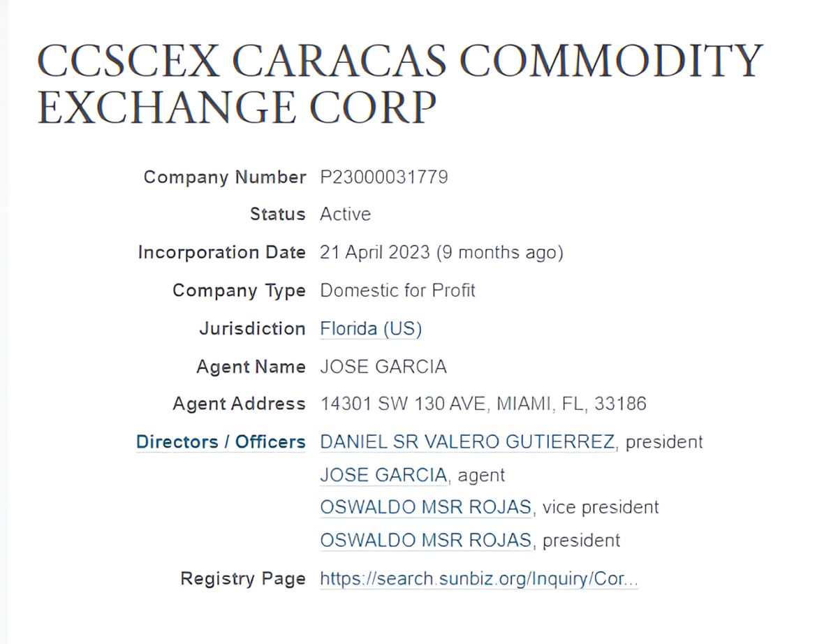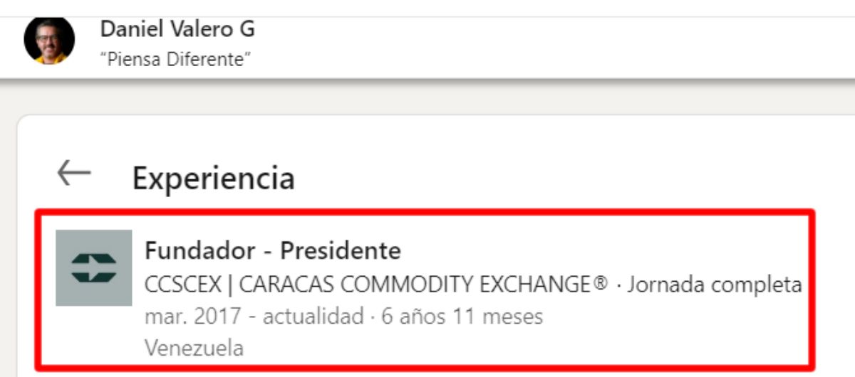 Sin embargo, en su perfil en LinkedIn, Valero Gutiérrez indica que se desempeña como fundador y CEO de Caracas Commodity Exchange desde el año 2017.