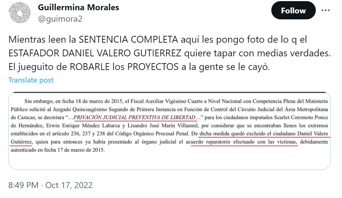 Inicialmente, en primera instancia, el Juzgado Cuarto declaró con lugar la demanda en contra de la empresa Distribuidora Monte Carlo Venezuela C.A., representada por Valero Gutiérrez. Sin embargo, Valero Gutiérrez apeló la decisión en noviembre de 2021.
