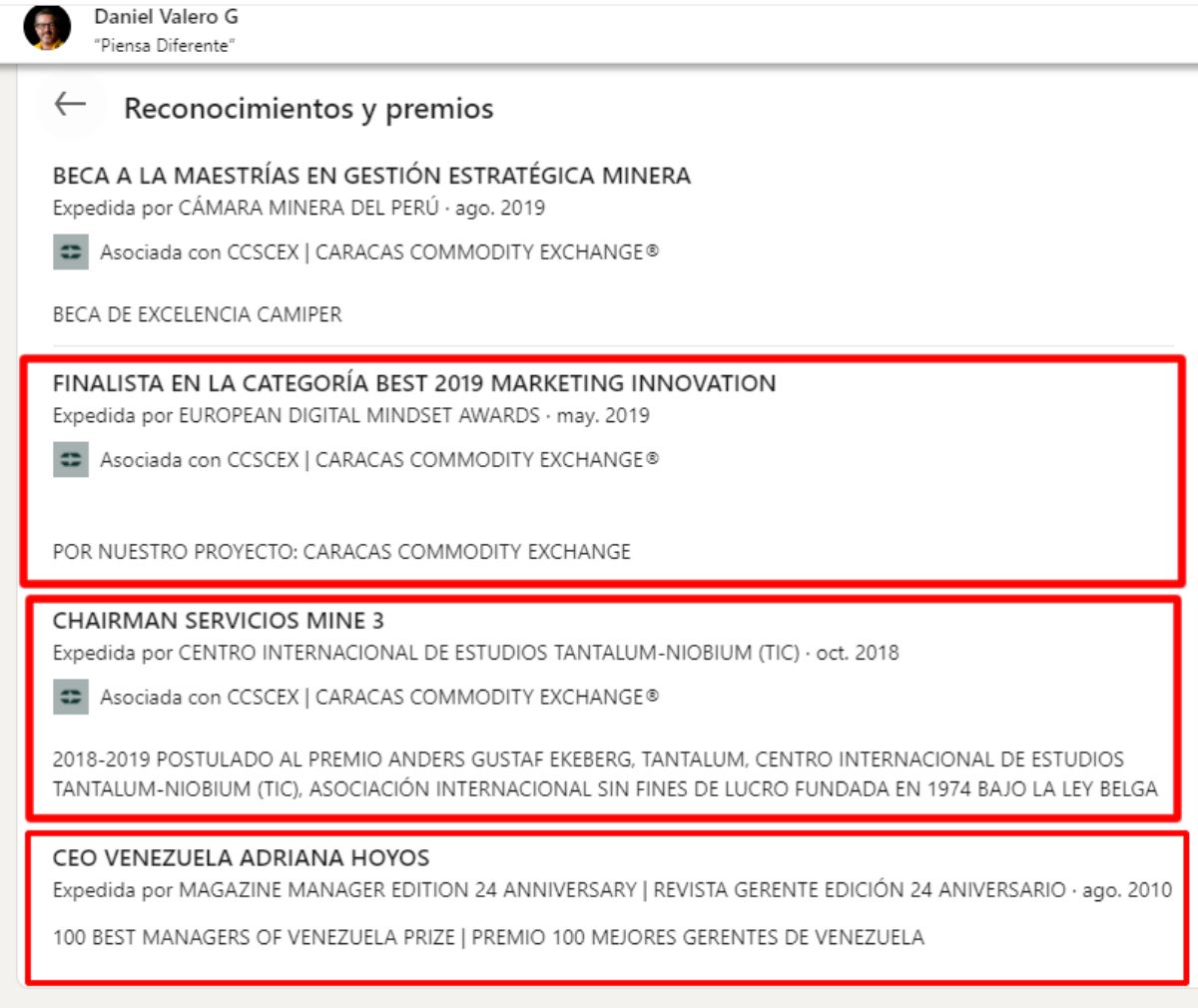 Valero también asegura en su perfil profesional que su proyecto Caracas Commodity Exchange (CCSCEX) fue finalista de los Premios Europeos de Mentalidad Digital 2019 (European Digital Mindset Awards 2019), en la categoría Marketing Innovation. Quizás a eso se deba que el nombre CCSCEX no figure entre los ganadores de ese año, pues según Valero, CCSCEX solo fue finalista.
