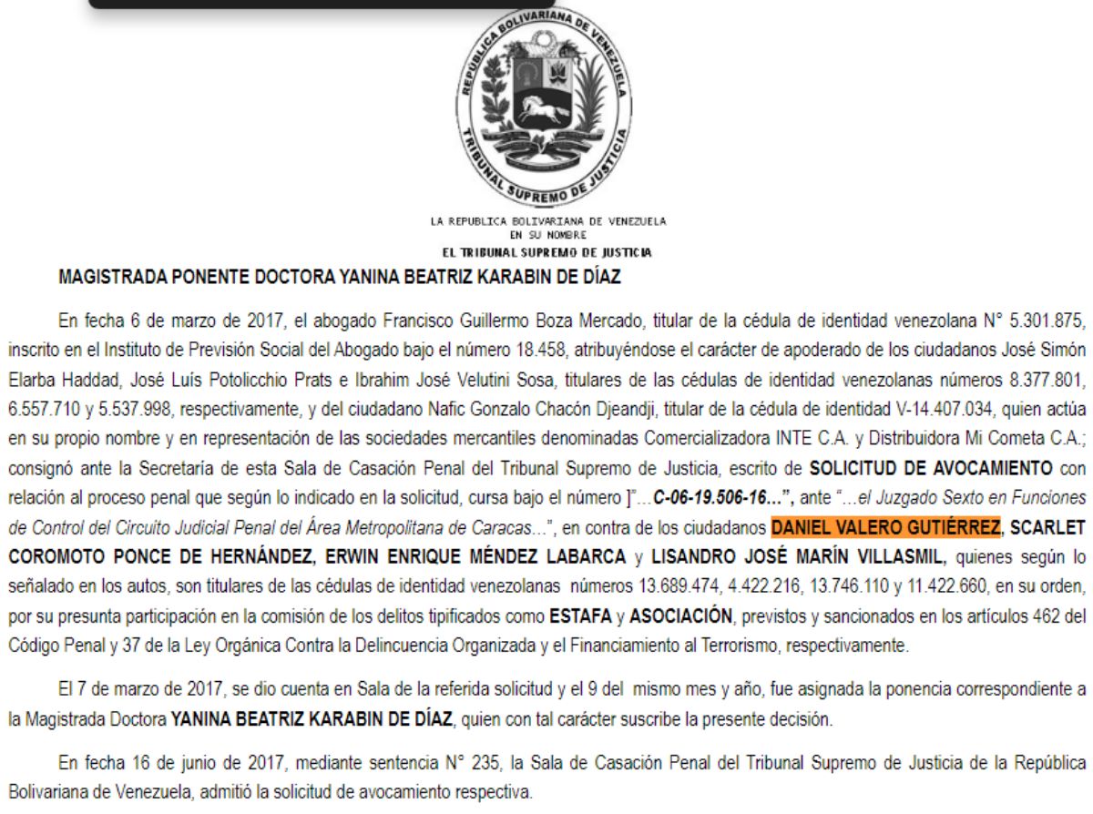 Ante esta situación, los demandantes acudieron al Ministerio Público en enero de 2014. La Fiscalía investigó el caso y en febrero de 2015 presentó acusación contra Daniel Valero Gutiérrez, Scarlet Ponce de Hernández, Erwin Méndez Labarca y Lisandro Marín Villasmil por los delitos de estafa y asociación para delinquir. El proceso penal se vio afectado por varios vicios procesales, cambios de juzgados y diferimientos de audiencias, lo que llevó a los demandantes a solicitar el avocamiento de la Sala de Casación Penal del Tribunal Supremo de Justicia en marzo de 2017.