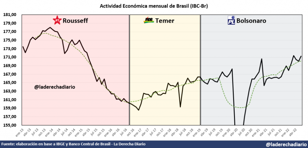 El IBGE confirmó que el PBI trimestral alcanzó el nivel más alto desde el año 2014, y la actividad con frecuencia mensual obtuvo el resultado más elevado desde abril de 2015. La economía se encamina de recuperarse de la severa crisis financiera desatada durante la última administración del PT bajo la expresidenta socialista Dilma Rousseff.