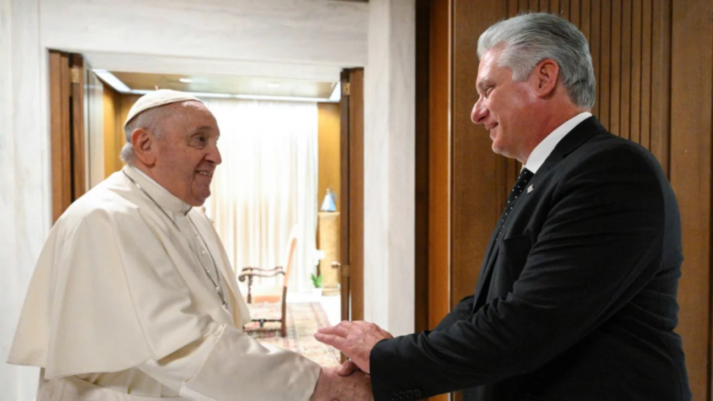 “Me encanta verlo aquí, me encanta que haya venido” le dijo a Díaz-Canel, quien visitó el Vaticano este martes, para una reunión que se prolongó por casi una hora. El títere de Raúl Castro le agradeció al Papa haber aceptado recibirlo a días de haber salido del hospital.