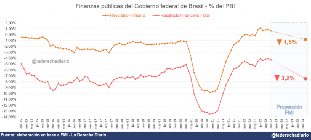 El FMI pronostica que el déficit fiscal financiero del Gobierno federal brasileño se disparará al 7,5% del PBI en 2023, partiendo de una cifra que no supera el 5% del producto. Descontando el enorme peso de los intereses de la deuda pública sobre el presupuesto, el superávit primario heredado de Bolsonaro se perdería completamente y el 2023 finalizaría con un déficit de 0,82% del PBI.