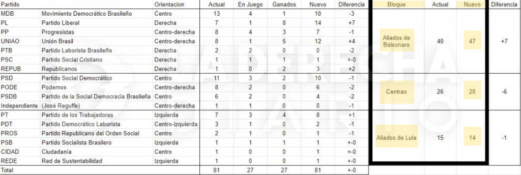 A diferencia de la Cámara Baja, Bolsonaro no tenía la mayoría en el Senado antes de esta elección. Su bloque estaba comprendido por 40 senadores, mientras que el Centrao tenía 26 y Lula 15, por lo que si éstos dos se unían, podían bloquearle cualquier ley con 41 votos negativos, lo cual hicieron en reiteradas ocasiones en los últmos dos años.
