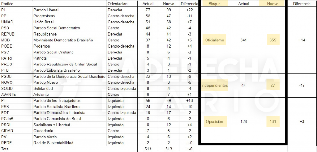 De esta manera, el Partido Liberal (PL) de Bolsonaro y sus aliados en el Congreso: Movimiento Democrático Brasileño (MDB), Progresistas (PP), Unión Brasil (UNIAO), Partido Laborista Brasileño (PTB), Partido Social Cristiano (PSC) y Republicanos (REP) ganaron la mayoría propia tanto en el Senado como en la Cámara de Diputados.