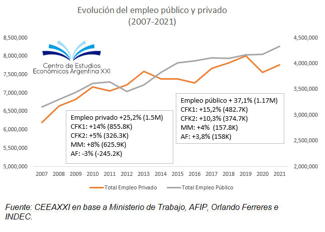 El mandato de Mauricio Macri, tuvo sus altas y bajas con el empleo privado, incorporando finalmente 625 mil trabajadores (+8%) y 158 mil trabajadores del sector público (+4%) Por último, analizando los primeros dos años del mandato de Alberto Fernández, se observa que el empleo privado se redujo en más de 245 mil trabajadores (-3%), golpeado por la fuerte caída en el rubro Autónomos que estudiamos previamente mientras que la cantidad de empleados públicos se incrementó en 158 mil personas (+3,8%).
