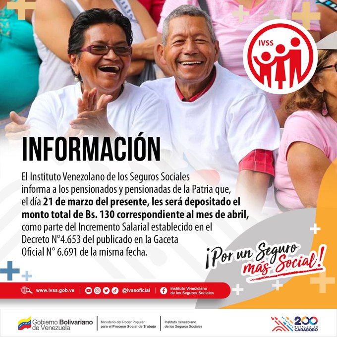 A partir de este lunes 21 de Marzo los pensionadas y pensionados de todo el país, comenzarán a cobrar el aumento salarial establecido en el Decreto Nro. 4.653, y publicado en la Gaceta Oficial Nro. 6.691.