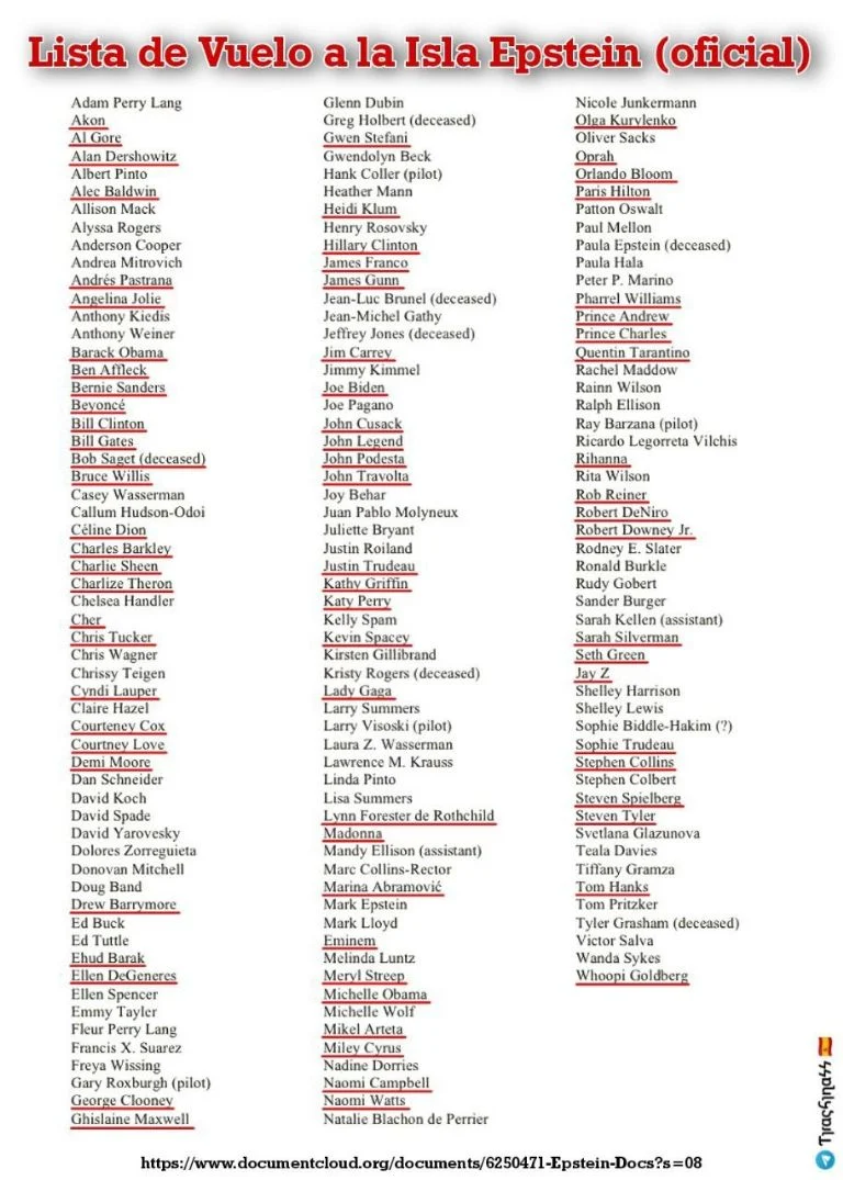 A partir de los registros de vuelos del “Lolita Express“, la Justicia de los Estados Unidos reconstruyó una lista de 166 nombres que en alguna oportunidad volaron junto a Epstein. Es importante aclarar que no todos los nombres que aparecen en esta lista viajaron a la isla, o participaron de los servicios de prostitución infantil.