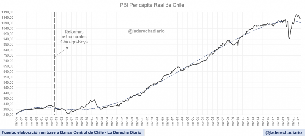 Bajo la influencia y las ideas de Milton Friedman, las reformas dieron lugar al “milagro económico chileno”, una experiencia de casi 40 años con crecimiento ininterrumpido. El modelo no solo fue sostenido y convalidado en democracia, sino que se profundizó aún más a lo largo de la década del 90.
