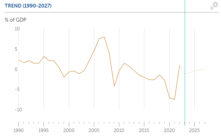 Déficit fiscal consolidado de Chile entre 1990 y 2022, proyecciones a partir de 2023. Fuente: Fondo Monetario Internacional (FMI).