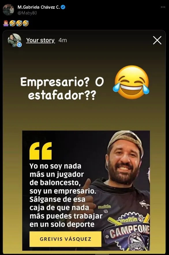 Vásquez expresó en la imagen que no es “nada más un jugador de baloncesto, soy un empresario. Sálganse de esa caja de que nada más puedes trabajar en un solo deporte“, a lo que la diplomática chavista respondió: “¿Empresario? ¿o estafador?“.
