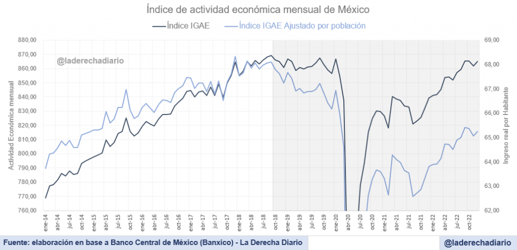 Probablemente el dato más preocupante para la trayectoria de la economía mexicana sea la dimensión del ingreso real por habitante. El índice IGAE ajustado por población acumuló una fuerte caída del 3% entre diciembre de 2018 y diciembre de 2022, un indicador que denota un deterioro generalizado en la calidad de vida de los mexicanos desde la llegada de la izquierda al poder.