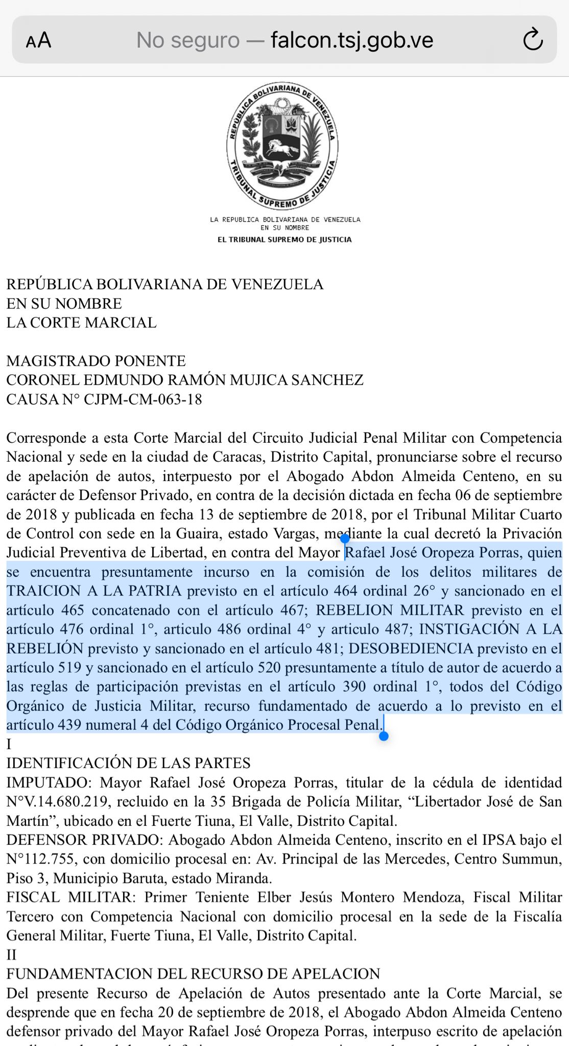 Según CAUSA Nº CJPM-CM-063-18. Corresponde a esta Corte Marcial del Circuito Judicial Penal Militar con Competencia Nacional y sede en la ciudad de Caracas, Distrito Capital, se pronunció sobre el recurso de apelación, interpuesto por el Abogado Abdon Almeida Centeno, en su carácter de Defensor Privado, en contra de la decisión dictada en fecha 06 de septiembre de 2018 y publicada en fecha 13 de septiembre de 2018, por el Tribunal Militar Cuarto de Control con sede en la Guaira, estado Vargas, mediante la cual decretó la Privación Judicial Preventiva de Libertad, en contra del Mayor Rafael José Oropeza Porras, quien se encuentra presuntamente incurso en la comisión de los delitos militares de TRAICION A LA PATRIA previsto en el artículo 464 ordinal 26º y sancionado en el artículo 465 concatenado con el artículo 467; REBELION MILITAR previsto en el articulo 476 ordinal 1°, articulo 486 ordinal 4º y articulo 487; INSTIGACIÓN A LA REBELIÓN previsto y sancionado en el artículo 481; DESOBEDIENCIA previsto en el articulo 519.