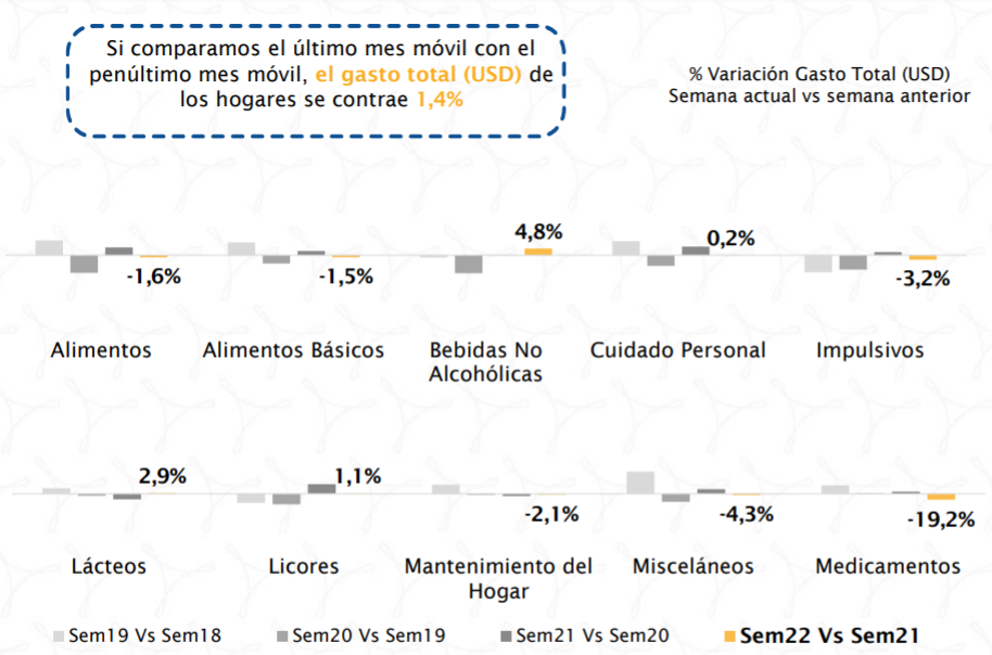 Si se compara el último mes móvil con el penúltimo mes móvil, el gasto total en dólares de los hogares se contrajo 1,4%.