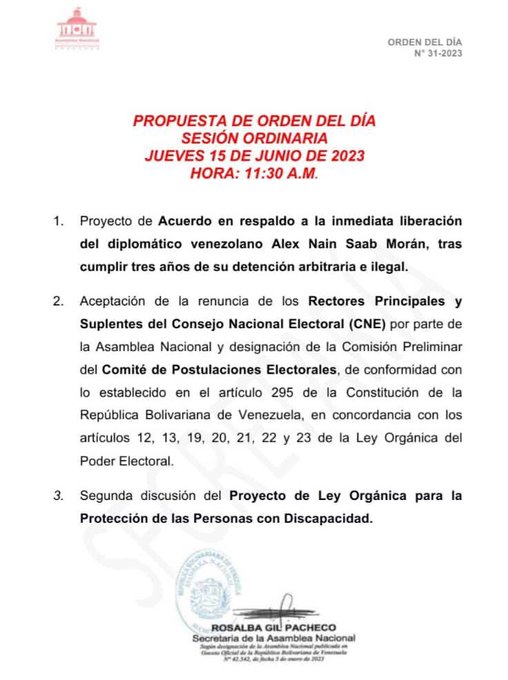 Así lo reveló un documento con la propuesta del día para la Sesión Ordinaria de la Asamblea Nacional prevista este venidero jueves 15 del mes en curso.
