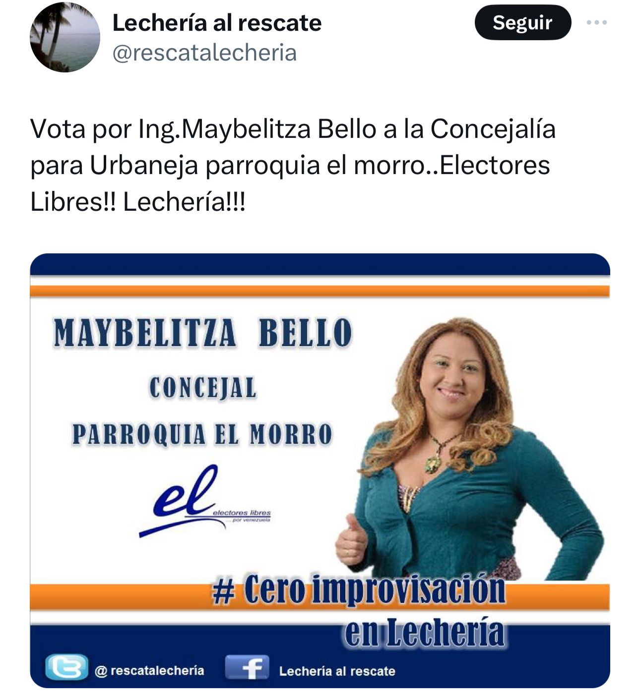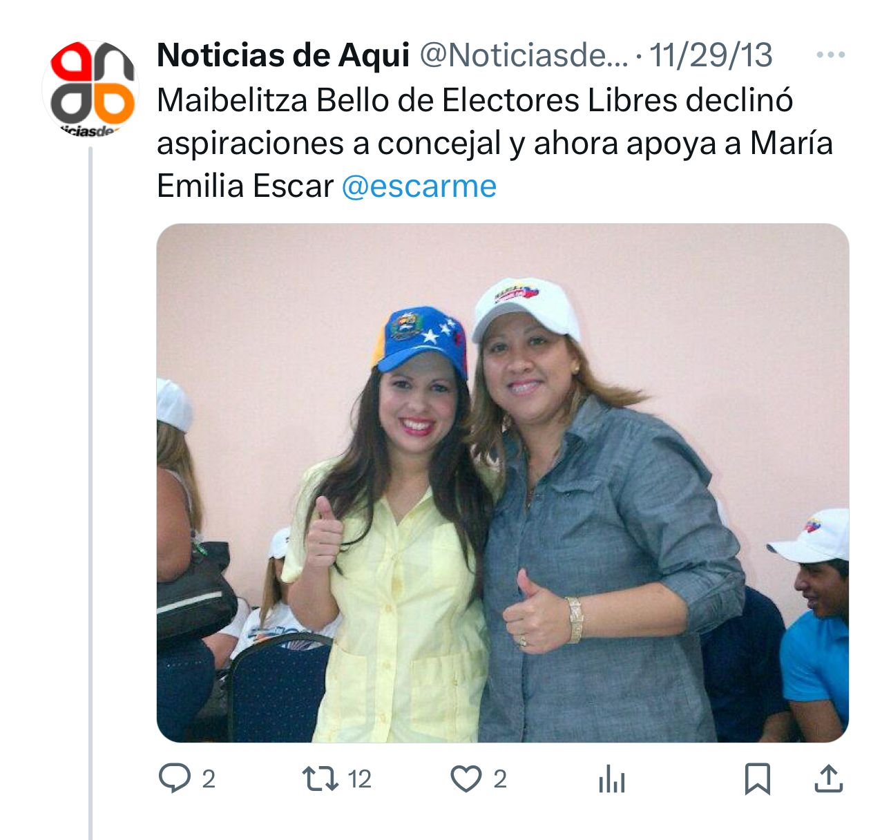 En la siguente imagen observamos como Maibelitza Bello de Electores Libres, declinó aspiraciones a concejal y apoyaba a María Emilia Escar, candidata del Partido Socialista Unido de Venezuela, PSUV: