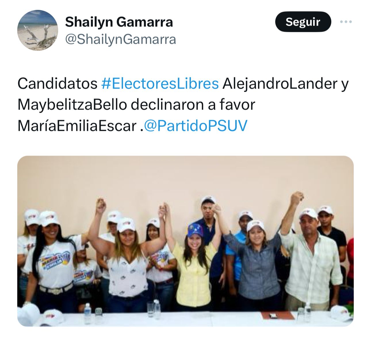 En la siguente imagen observamos como Maibelitza Bello de Electores Libres, declinó aspiraciones a concejal y apoyaba a María Emilia Escar, candidata del Partido Socialista Unido de Venezuela, PSUV: