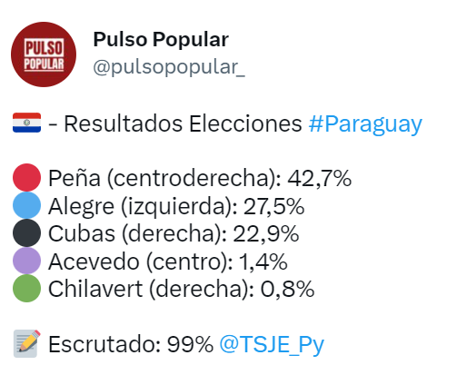 Tras las elecciones de este domingo 30 de abril, el ex ministro de Economía, Santiago Peña, se convirtió en el presidente electo de la República del Paraguay con el 42,74% de los votos, venciendo al izquierdista Efraín Alegre por una amplia diferencia de 15 puntos.