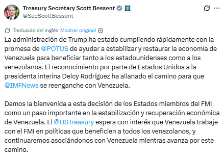 Según lo expresado por el Secretario del Tesoro de EEUU, Scott Bessent, el reconocimiento institucional por parte de Washington ha sido determinante para que el Fondo Monetario Internacional (FMI) reanude su relación con Venezuela.