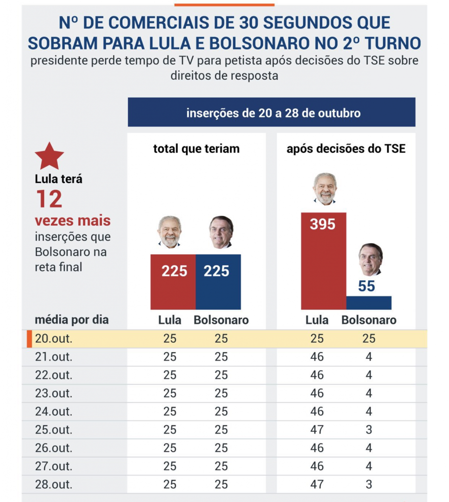 De esta manera, a pesar de que a cada uno le correspondían 225 minutos para la semana del 20 al 28 de octubre, Lula tendrá 395 minutos y Bolsonaro tan solo 55. A partir del 21 de octubre, los 25 minutos diarios de Bolsonaro serán reducidos a solo 4, mientras que Lula tendrá 46 minutos por día.
