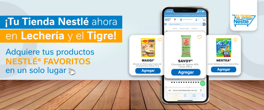 Después de una activación exitosa en Caracas, Margarita y Valencia, Nestlé Venezuela sigue innovando y extiende el alcance de su plataforma de Comercio electrónico, www.tutiendanestle.com.ve, a distintos municipios en El Tigre: Simón Rodriguez, San José de Guanipa, Pariaguán, Anaco y Pedro María Freites, así como también llega a Lecherías, contemplando los siguientes municipios: Simón Bolívar, Diego Bautista Urbaneja, Juan Antonio Sotillo.