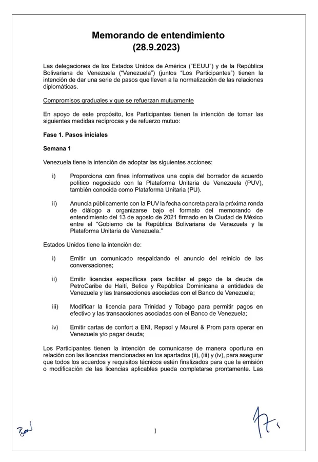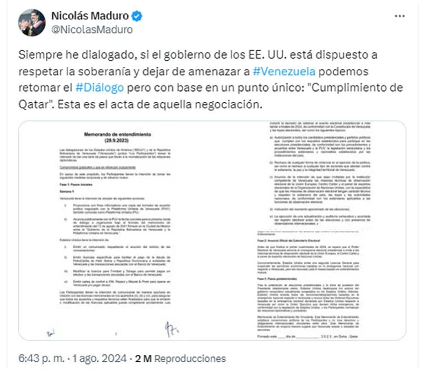 El mandatario venezolano, Nicolás Maduro, insistió en retomar el diálogo bilateral con EE. UU. que tan buenos resultados le trajo. El 1 de agosto pasado publicó en su cuenta de la red social X, una versión del memorando, de tres páginas. Efecto Cocuyo verificó que se corresponde con el documento finalmente suscrito por las partes.