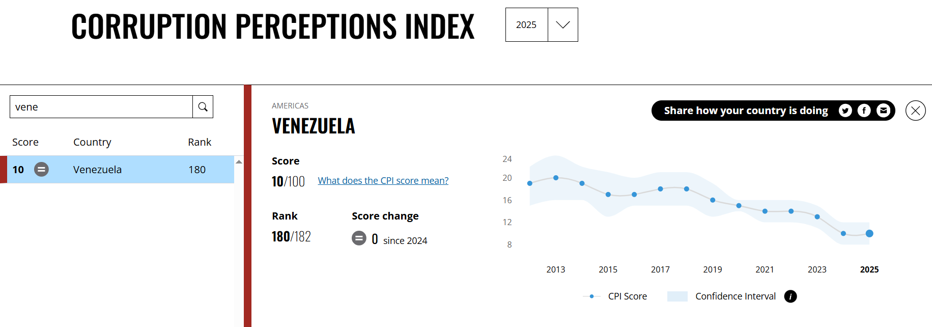 En el informe de 2024, TI dijo que las tres naciones con peor puntuación fueron Sudán del Sur (8), Somalia (9) y Venezuela (10).
