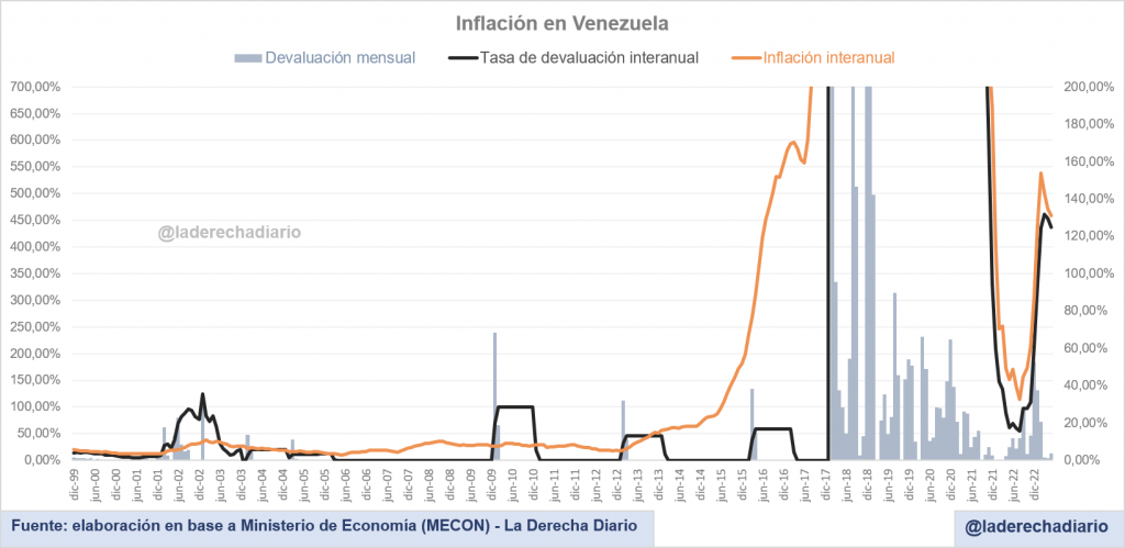 La tasa de inflación interanual cayó al 458% con respecto a mayo de 2022, habiéndo registrado un alza del 471% en abril, 501% en marzo y 537% en febrero respectivamente. Sin embargo, esta tendencia hacia la baja se contrasta con el repunte mensual de la variación de precios, que podría ponerle fin al proceso y sumir a Venezuela en un nuevo y violento brote inflacionario.